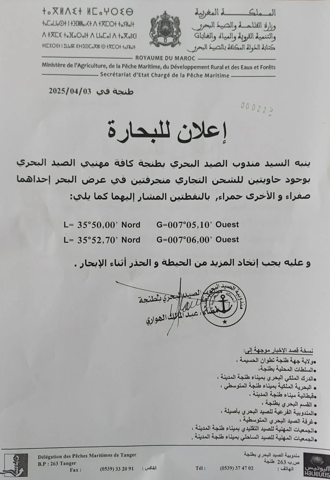 حذرت مندوبية الصيد البحري بطنجة، في إعلان رسمي، مهنيي الصيد البحري العاملين على طول السواحل المحلية من خطر حاويتين للشحن منجرفتين في البحر، مما قد يشكل تهديدا مباشرا للسفن التي تمر عبر المنطقة.