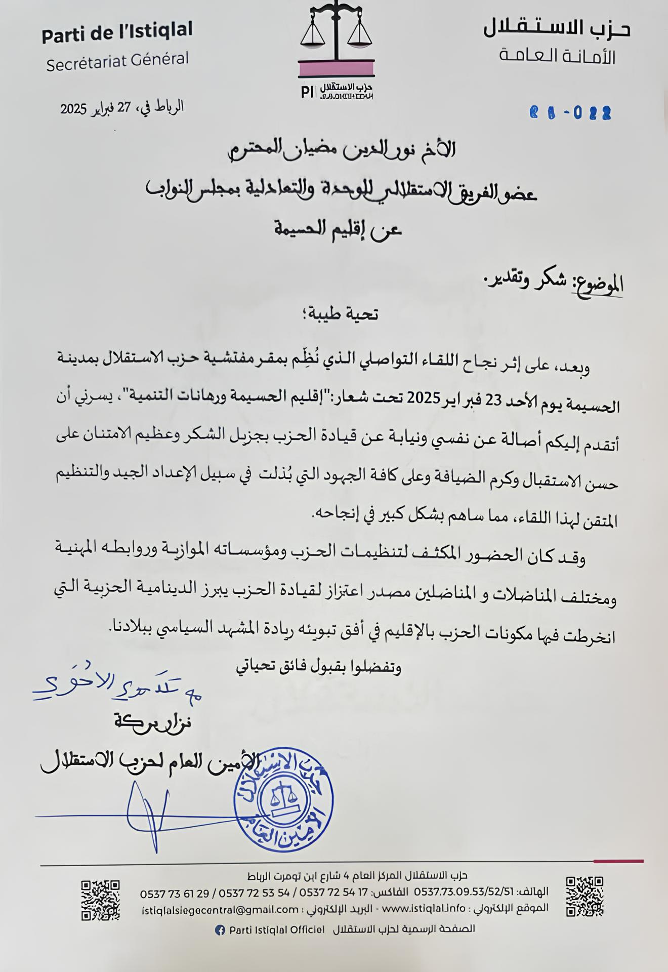 وجه نزار بركة، الأمين العام لحزب الاستقلال، رسالة شكر وتقدير إلى القيادي نورالدين مضيان، عقب النجاح الكبير الذي حققه اللقاء التواصلي الاستقلالي المنعقد يوم الأحد 23 فبراير 2025 بمدينة الحسيمة.